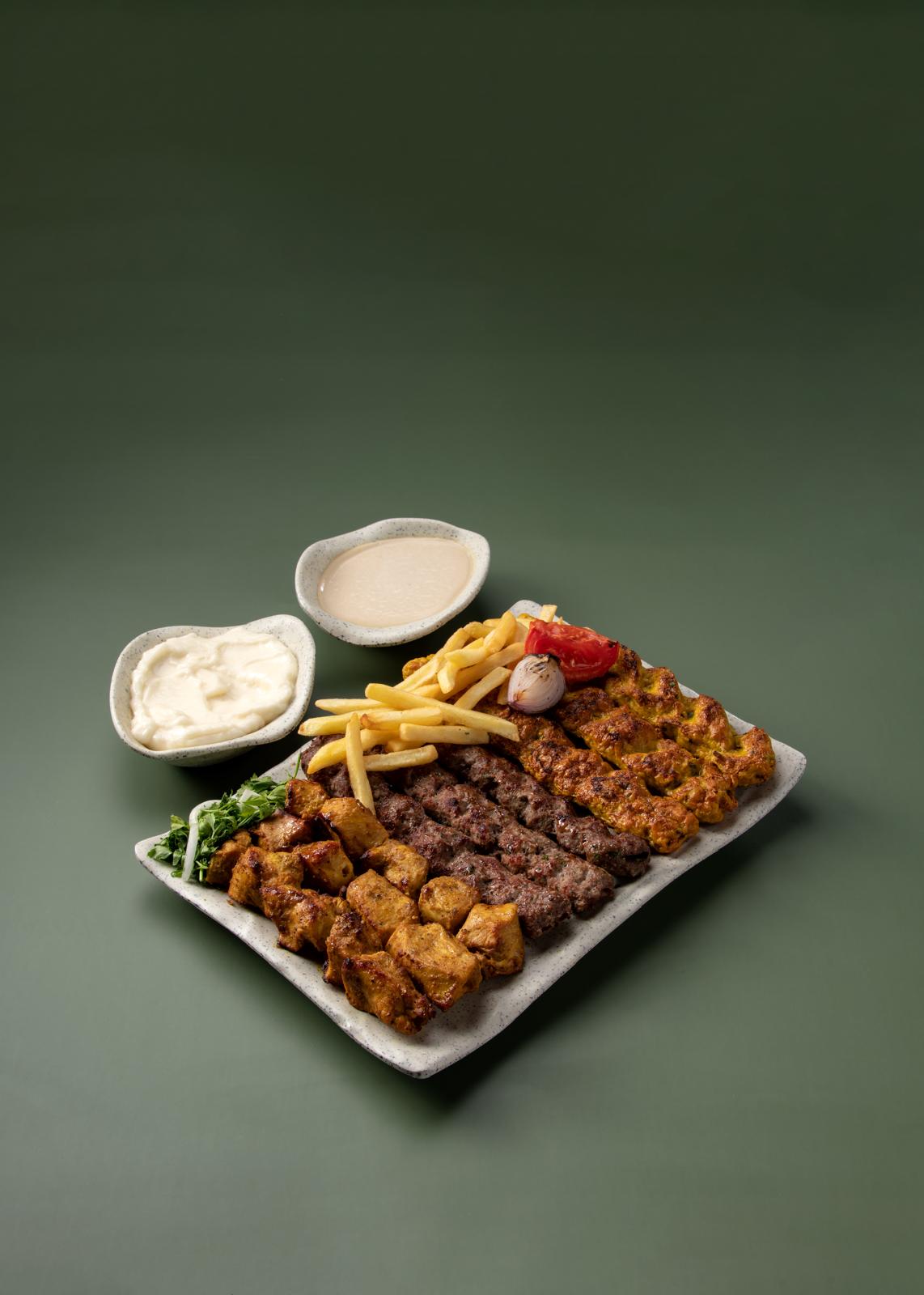 كباب لحم مشوي علي الفحم ببهارات خاصة ومميزة يقدم مع ارز بخاري اصفر