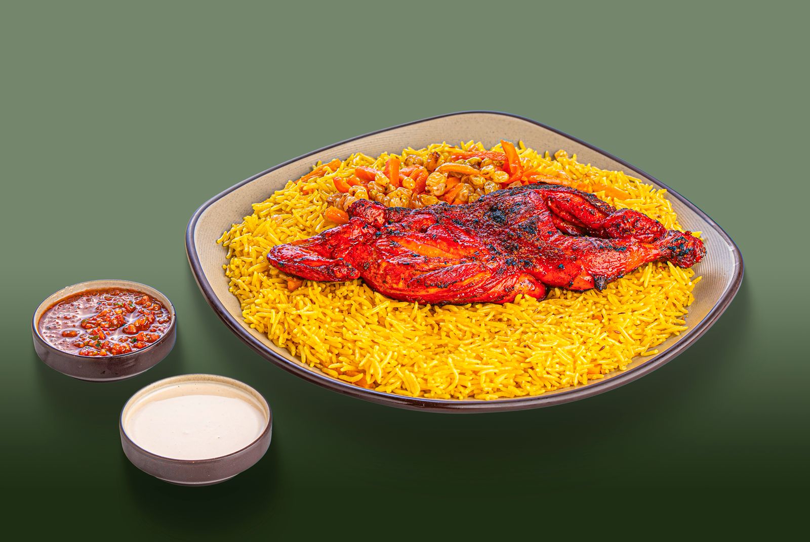كباب دجاج مشوي علي الفحم ببهارات خاصة يقدم مع ارز بخاري اصفر